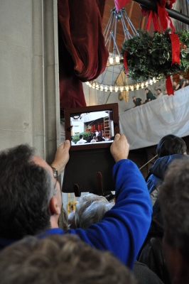 As he raised his iPad above his head, the crowd behind us cheered. They didn’t have the line-of-sight into the banquet hall, but they could see the event on Brian’s screen. The cheering continued as the make-shift Jumbotron documented the tree-raising and allowed the crowd to witness the event first-hand.