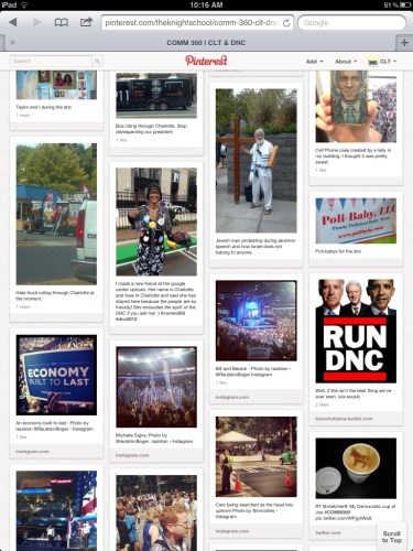 I embarked on another classroom teaching and learning experiment this fall on Pinterest. One hundred of our students at Queens University of Charlotte were dispatched into the venues and streets of Charlotte as student interns and volunteers during the 2012 Democratic National Convention.