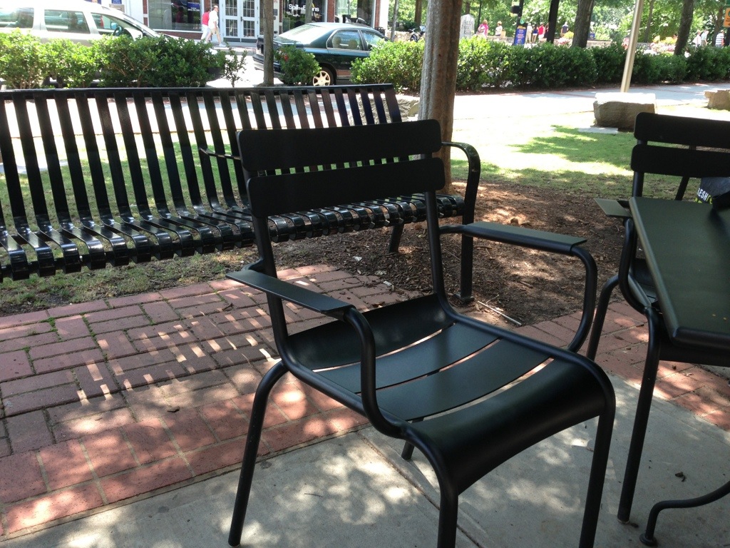 In proxemics terms, the benches facing the table were within personal distance (3-6 feet) of the table and chairs. This would suggest that people seated at the table and chairs would feel a need to converse with people sitting on adjacent benches