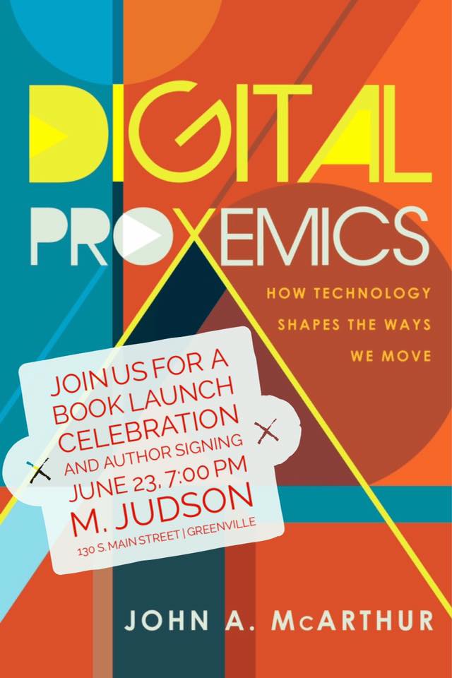 GREENVILLE, SC — On June 23, 2016, M. Judson Booksellers & Storytellers hosted a book launch celebration for Dr. John A. McArthur’s first book, Digital Proxemics: How Technology Shapes the Ways We Move. Dr. McArthur read two sections of the book, describing proxemics to the audience and introducing the connection between proxemics and digital technologies. In attendance were friends of the author, professors from area universities, and interested community members.